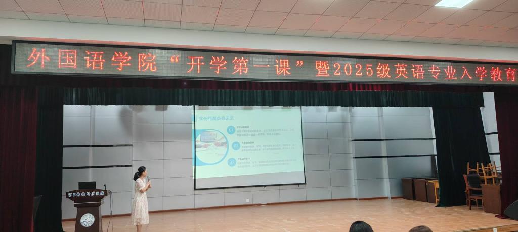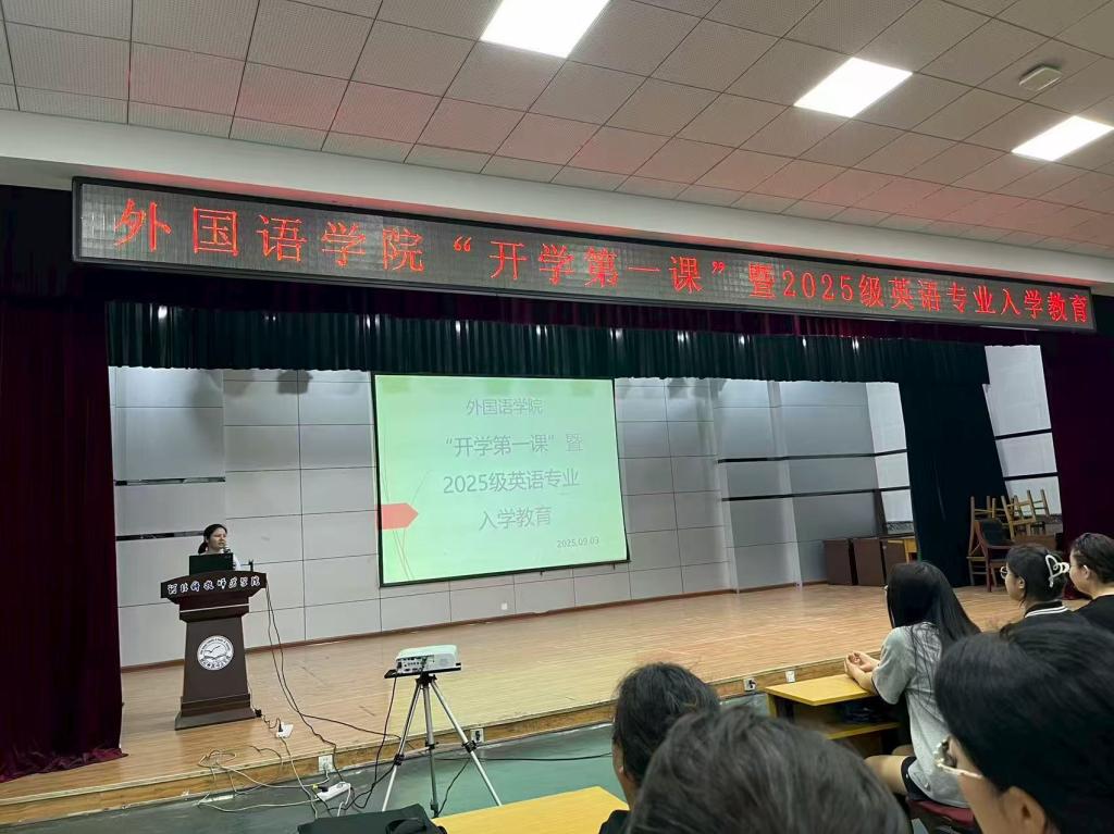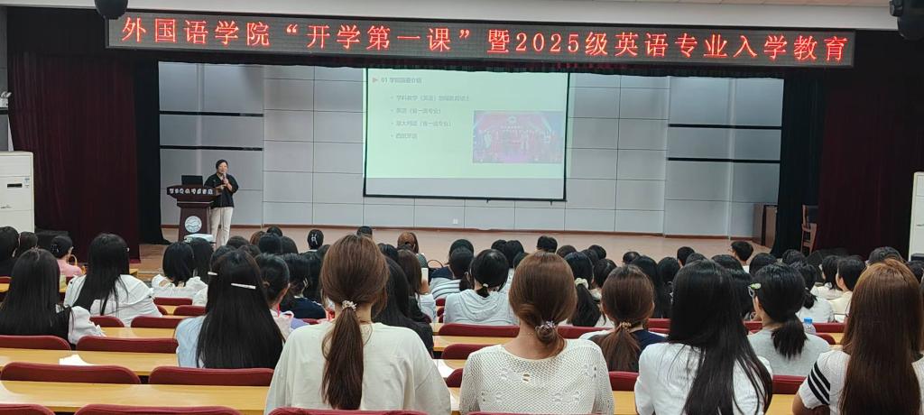2025年9月3日,太阳成tyc33455cc在秦皇岛校区多功能厅成功举办“开学第一课”暨2025级英语专业入学教育,2025级新生及英语专业骨干教师与会。