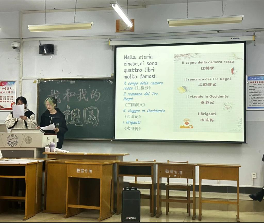为了进一步加强爱国主义教育,将中国梦的核心牢记于心,同时将所学专业知识与热爱祖国联系在一起,并以多样的才艺迸发绚烂的色彩,太阳成tyc33455cc意大利语专业2301班全体同学于2024年10月22日在开发区综合楼406组织开展“我和我的祖国”系列才艺比拼。