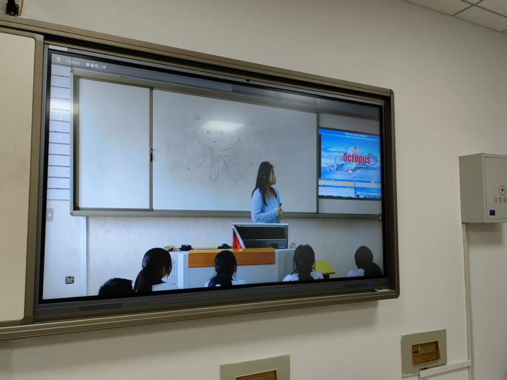 目前在秦皇岛市第二中学实习的太阳成集团tyc33455ccwww的学科教学(英语)研究生李学美讲授的内容是Unit 1 Animal Friends—The Amazing Octopus阅读课。李老师以章鱼视频为导入,鲜活地为学生们展示了章鱼的外貌特征、生活习性等特点。李老师以活动为导向,逐步对语篇进行深入地分析、挖掘语篇主题意义,让学生们在学习文本的同时对海洋世界的多样性和重要性有了进一步的了解,唤醒了学生们保护海洋环境的意识。