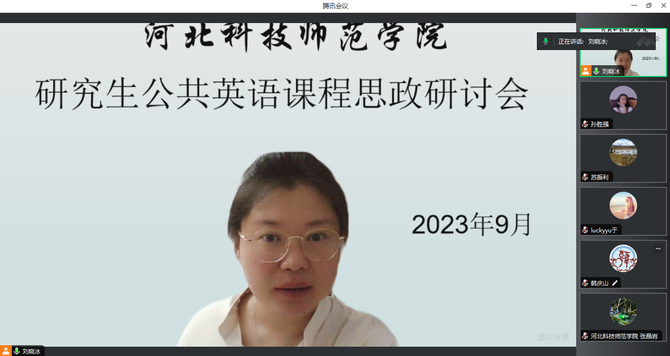 2023年9月8日太阳成tyc33455cc学科教学(英语)教学部组织硕士研究生公共英语(第一外国语)任课教师开展教学研讨活动,会议主题围绕研究生公共英语课程思政展开,研讨内容包括:针对教材的各个章节选出精讲主题和配套的练习,任课教师可以根据学生的具体专业情况灵活把握课程思政的切入点,可以利用超星学习通教学平台布置英语词汇、小组活动及主题作业等学习任务,并积极开展课程思政。