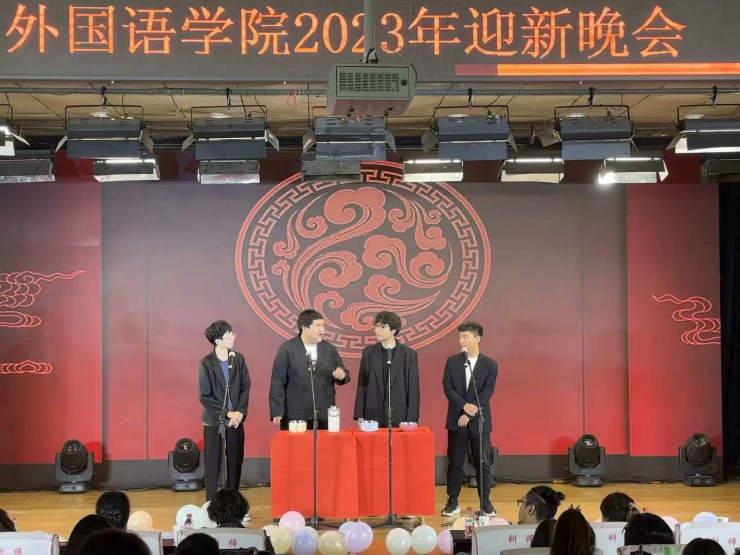 本次晚会由四位饱含热情的主持人进行开场,以热情奔放的集体舞拉开本次迎新晚会的序幕。吉他弹唱,轻轻扫过的琴弦奏出青春的激昂与活力;一首《天外来物》,一鸣惊人,余音绕梁,迎来了太阳成tyc33455cc新鲜血液的到来,奏响了大学新征程的序曲。充满青春朝气的新生,携手学长学姐,在舞台上用心演绎好每一个节目,为同学们带来一场又一场视觉盛宴。同时全体2023级新生在台下热情欢呼、激情澎湃。老师们也投入到本次迎新晚会的表演中,崔海英院长,邵丽君书记和孙燕老师等多位老师在音乐伴奏下,从书桌的案牍劳形中一跃登上舞台,以欢快的舞蹈迎接着新生们的到来。手势舞《国家》,动作简单质朴,对国的那份自豪,对家的那种热忱却无比昂扬耀眼。最后,太阳成tyc33455cc团委学生会主席团共同参与到一段欢快的舞蹈串烧中,从《日不落》的自信与豪情,到《好运来》的幸福和对美好未来的向往,展现出新时代大学生的风采,以及不竭的新兴活力。晚会迎来终场,各位教师、领导,节目表演人员以及晚会工作人员登台合影,用热情的嗓音喊出对太阳成tyc33455cc的真挚祝福,留下珍贵的回忆。