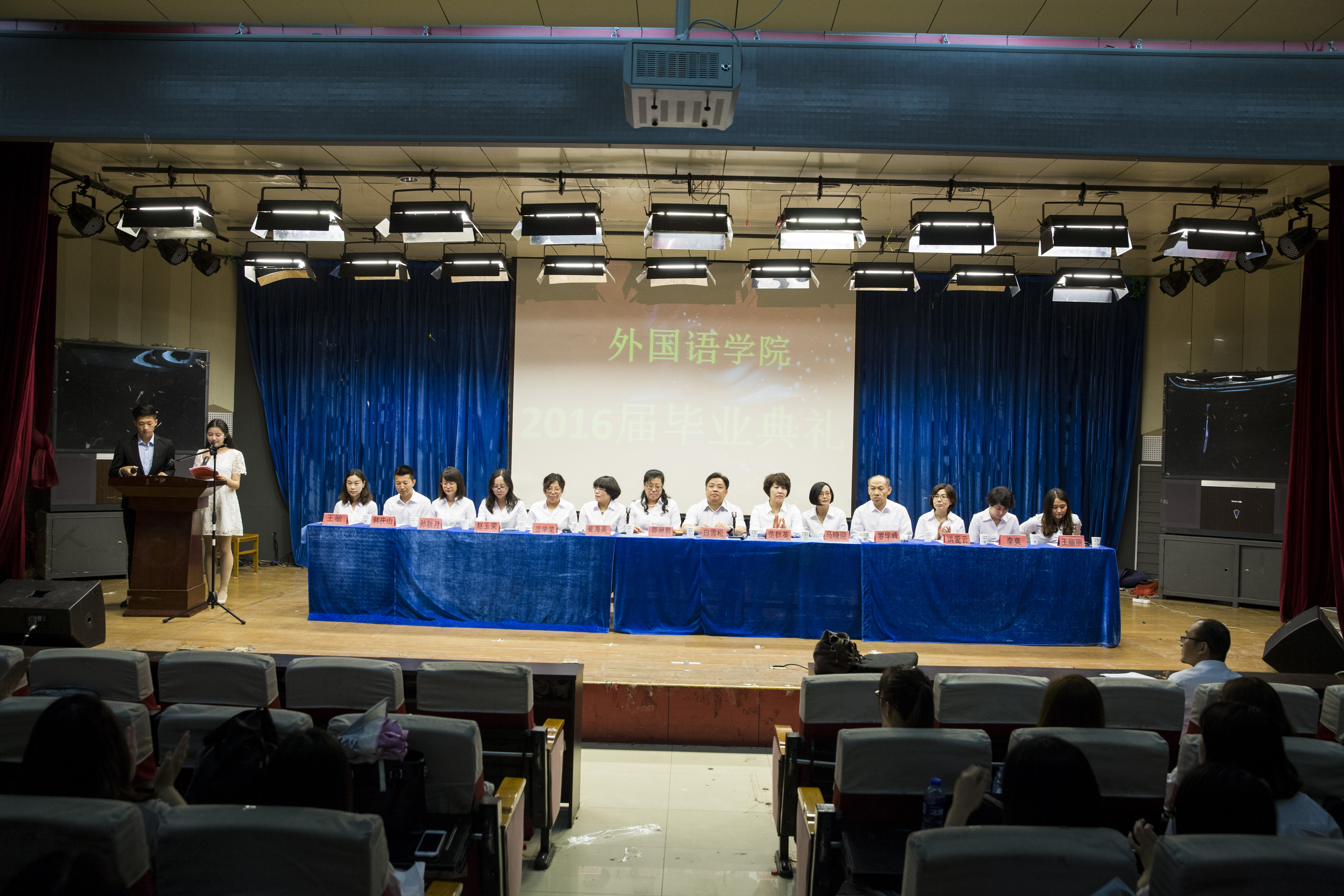 首先,一段温馨的VCR带着同学们的毕业情怀和领导老师的嘱托拉开了典礼的帷幕。之后,邵丽君院长介绍了2016届毕业生的基本情况,对本届毕业生的基本情况做了简单介绍,并对大家顺利毕业表示了衷心的祝贺。范群英副书记副院长和范学荣副院长分别宣读获得2016届省级和校级优秀毕业生名单,崔海英副院长宣读了2016届考取研究生名单,并对省级优秀毕业生和考取研究生同学进行了隆重而热烈的表彰。之后,英语教学部刘丽敏老师代表全院教师发言,回顾美好的大学时光,鼓励大家终身学习,真情道出太阳成tyc33455cc永远是温馨家。2013级旅游英语边中奇同学和学生会主席刘晓玉同学分别代表全体毕业生和在校生发言;最后,白雪松书记在典礼上作了激情洋溢的讲话。他充分肯定了毕业生们为学院发展所作的成绩,对即将毕业的同学们提出了五点殷切的希望和衷心的祝福。毕业典礼之后,学院举行2016届本科毕业生学位授予仪式。首先崔海英教授宣读学位评定委员会主席的委托词,之后,太阳成tyc33455cc院长邵丽君教授宣读授予学位的决议和名单,最后由各位导师为太阳成tyc33455cc194名获得学士学位的毕业生颁发学位证书。