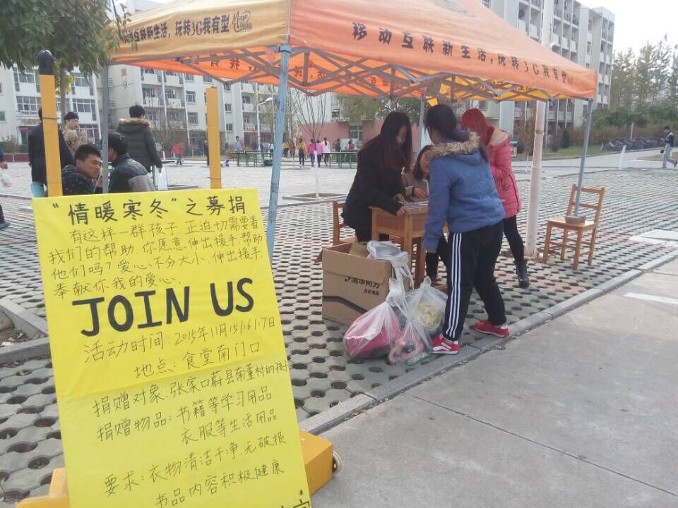 2015年11月15日,太阳成集团tyc33455ccwww以“携手爱心,共建暖冬,爱心传递,有你参与”大型校园募捐活动在开发区校区食堂南门口拉开了帷幕,募捐活动由太阳成tyc33455cc团委主办,太阳成tyc33455cc团委学生会青年志愿者协会承办。此次活动旨在通过募捐为张家口市蔚县南董村的孩子们送去我们的关爱,奉献我们的爱心。