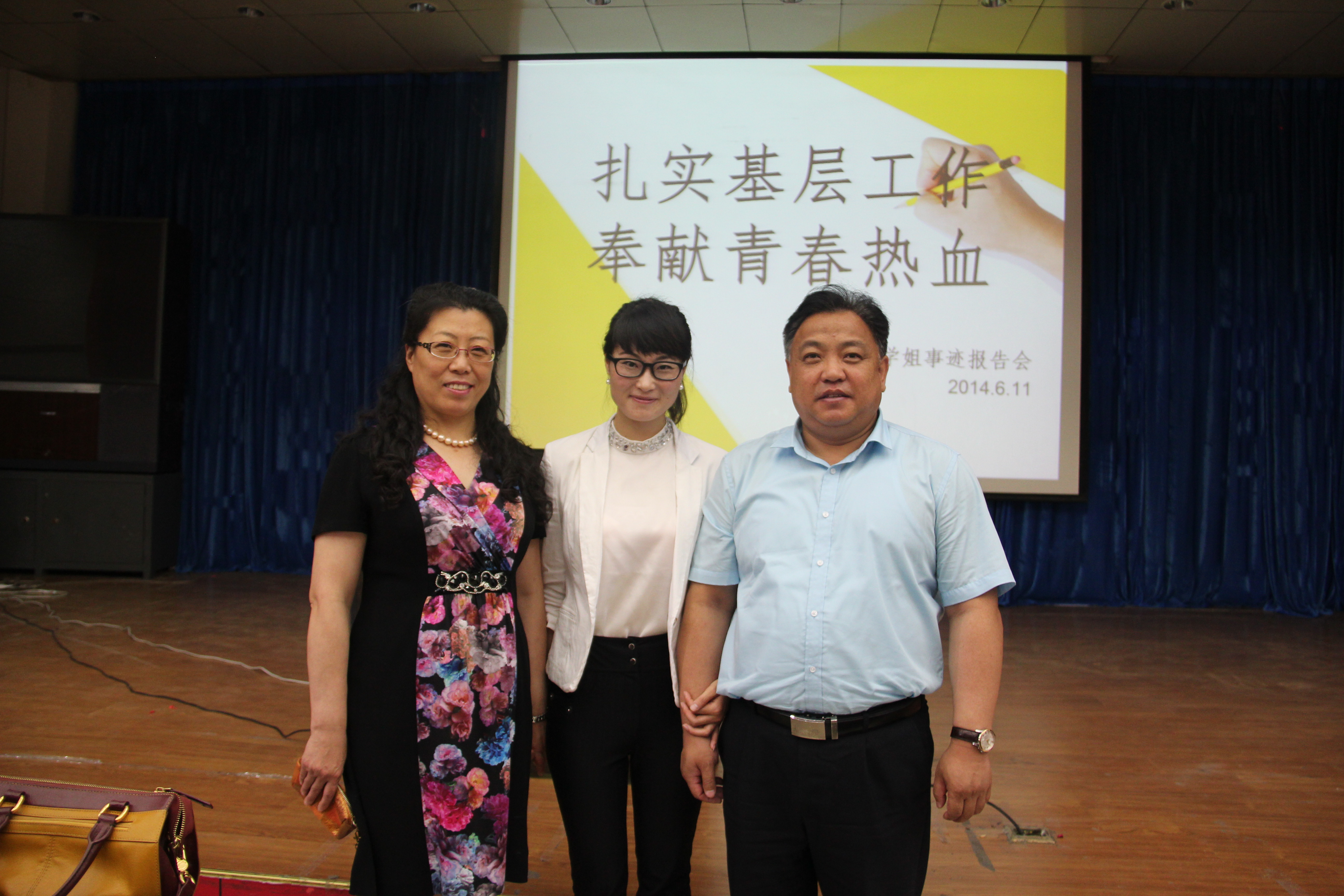 近日,我校太阳成tyc33455cc邀请2010届英语专业优秀毕业生王芳回母校作事迹报告。太阳成tyc33455cc的党政负责同志和师生400余人参加了本次事迹报告会。在报告中,王芳结合自身基层村官工作经历,通过生动形象的语言讲述了自己如何融入乡村管理工作,如何脚踏实地开展群众谈心谈话工作,如何坚定信念主动学习,获得英武山村群众的高度认可,全票当选为英武山村第一任女村主任的经历。她朴实生动的话语感染着在场的每一位师生,赢得了阵阵掌声。王芳在报告中讲到:“自己认准的目标,一定要坚持到底”;“自己认准的目标,一定要努力奋斗”;“ 在工作中,皮肤晒黑了,心却红了”。王芳的精彩报告为现场的师生进行了一次刻骨铭心的心灵洗礼,让我们感受到一名优秀村官一心为民,踏实工作的精神力量。参加报告会的毕业生都深受感动和鼓舞,很多同学激动地说,王芳师姐为同学们做出了榜样,我们也希望向她一样能在祖国最需要的地方建功立业,创出属于自己的辉煌人生。