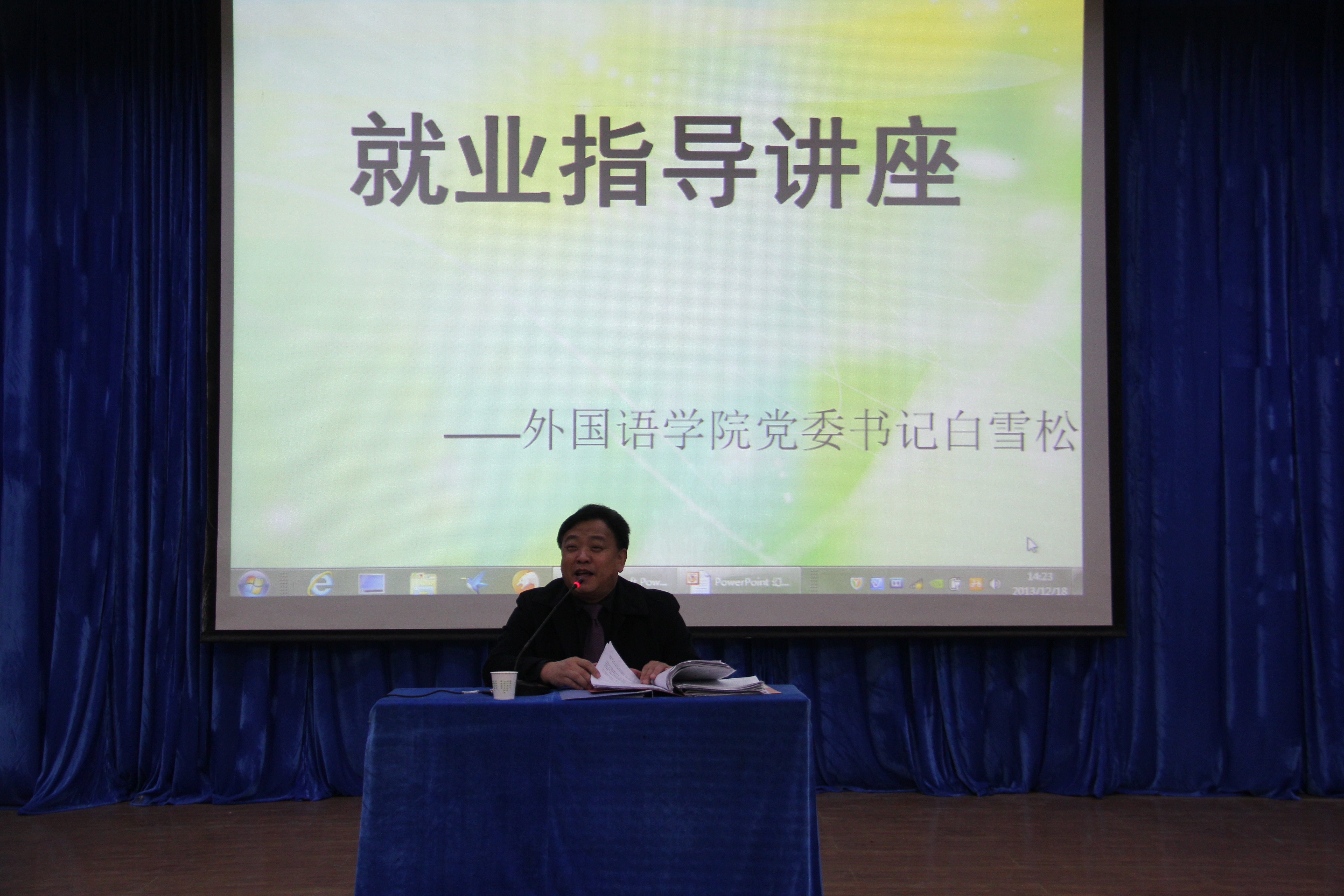 2013年12月18日下午两点,太阳成tyc33455cc党委书记白雪松老师在二楼报告厅给全体毕业生做了一场以“2014届毕业生就业形势分析”为主题的讲座。班级辅导员以及学工办各位老师参加了本次讲座。