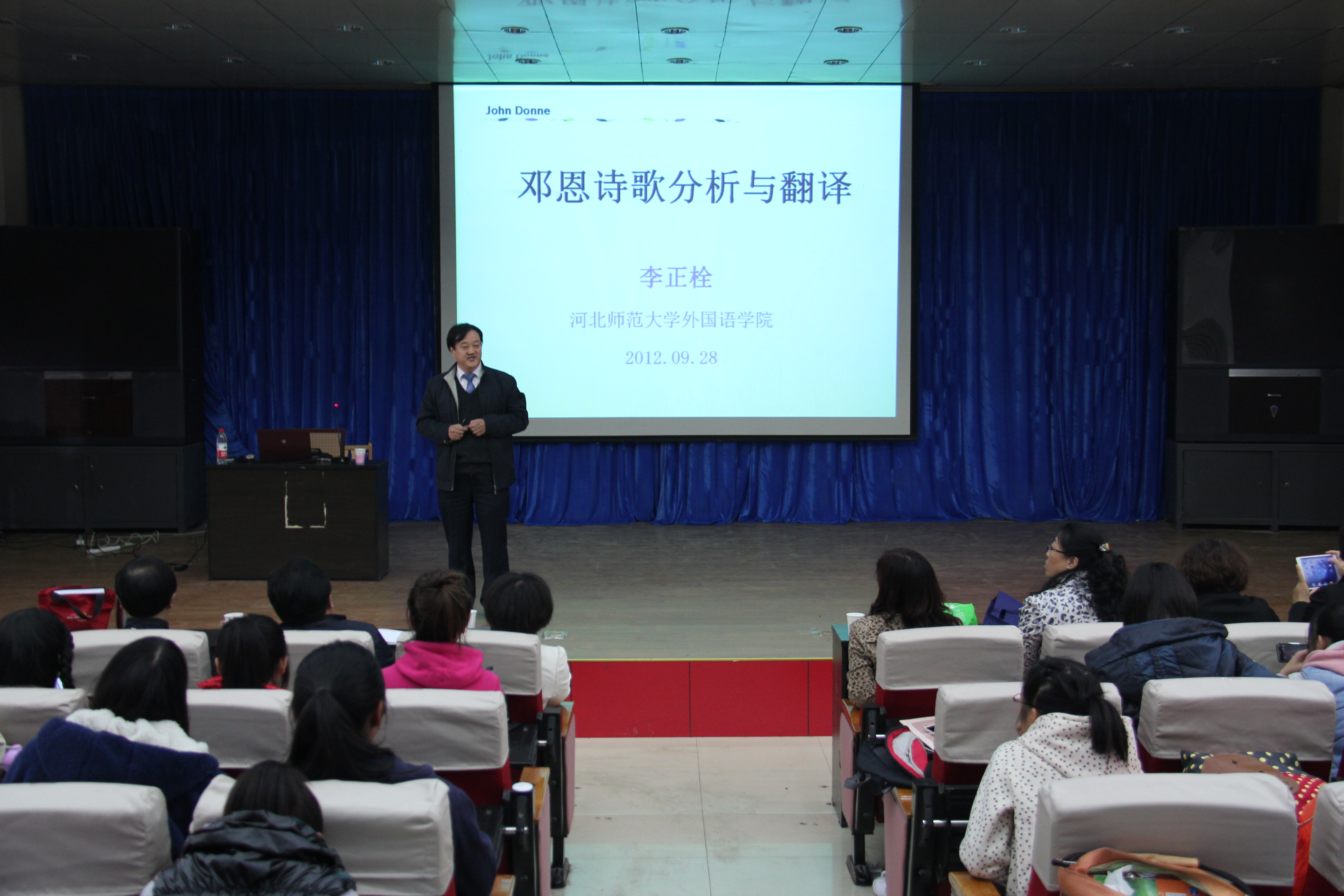 10月21日,校党委书记辛彦怀来到开发区校区太阳成tyc33455cc,聆听了河北师范大学太阳成tyc33455cc院长、河北省高校外语教学研究会会长、河北省翻译工作者协会会长李正栓教授做的题为《邓恩诗歌分析与翻译》的讲座。讲座在开发区校区学术报告厅举行,太阳成tyc33455cc全体教职工及英语专业学生参加了讲座。