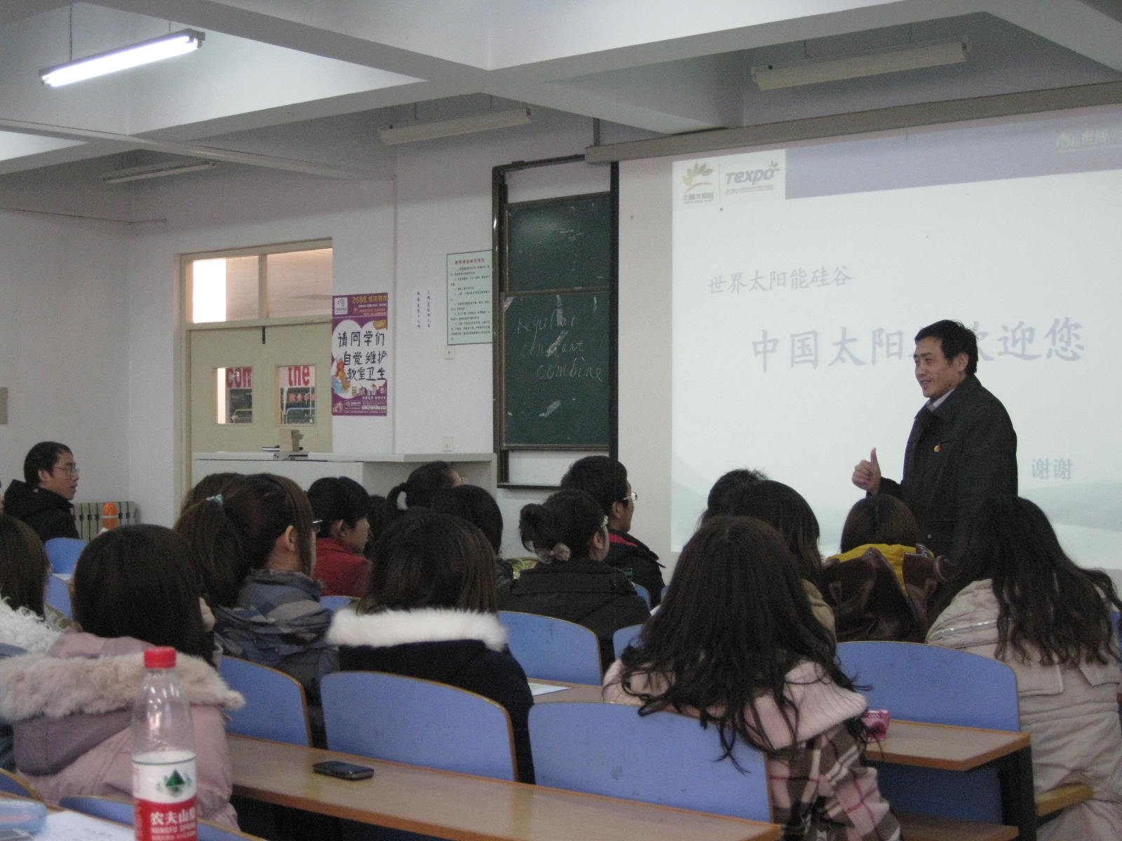 首先,皇明太阳能股份公司的招聘代表佟女士为毕业生播放皇明太阳能“太阳谷”的宣传片,之后将皇明太阳能股份有限公司的公司规模、产品研发、产业布局、发展前景、招聘岗位、基本待遇等情况向毕业生做了较为详细的讲解,并诚挚的邀请太阳成tyc33455cc的学生加入皇明,同时也欢迎大家有机会去皇明公司参观考察和实习。讲解后,刘朝晖书记代表学院欢迎皇明太阳能股份有限公司佟女士一行,并谈到自己去皇明公司考察的经历,要求全体毕业生转变观念,面向市场。通过对行业和企业的分析,鼓励大家去皇明太阳能实习就业。