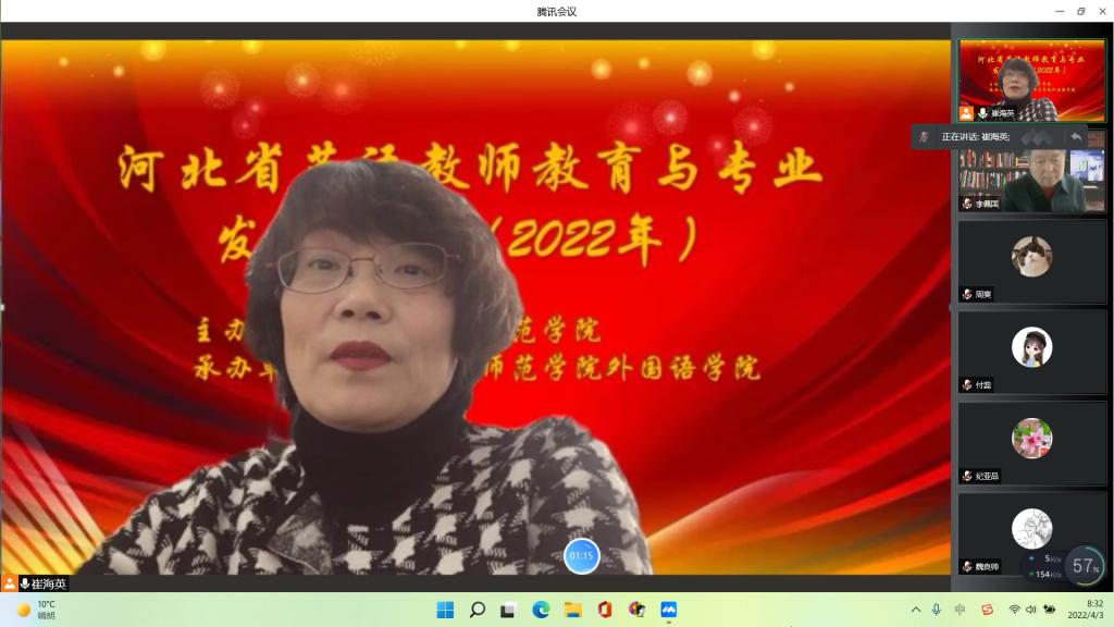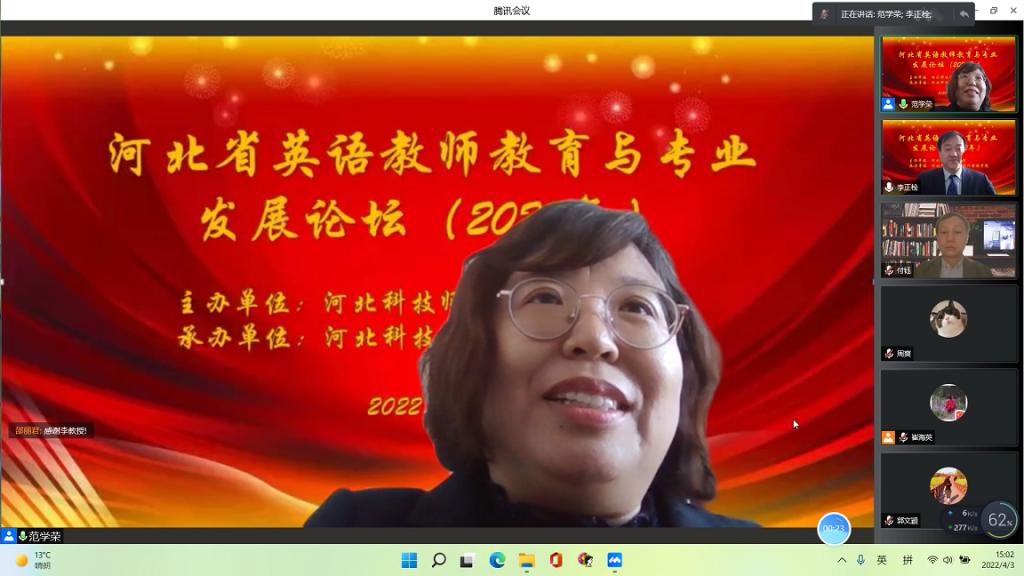 4月3日,由太阳成集团tyc33455ccwww主办,太阳成tyc33455cc承办的2022年河北省英语教师教育与专业发展论坛以腾讯会议形式线上召开,由太阳成tyc33455cc崔海英院长和范学荣副院长主持,特邀全国著名师范院校的五名专家、一位基础教育学校校长共同探讨河北省英语教师教育与专业发展的议题。学校党委副书记李佩国教授致开幕辞。