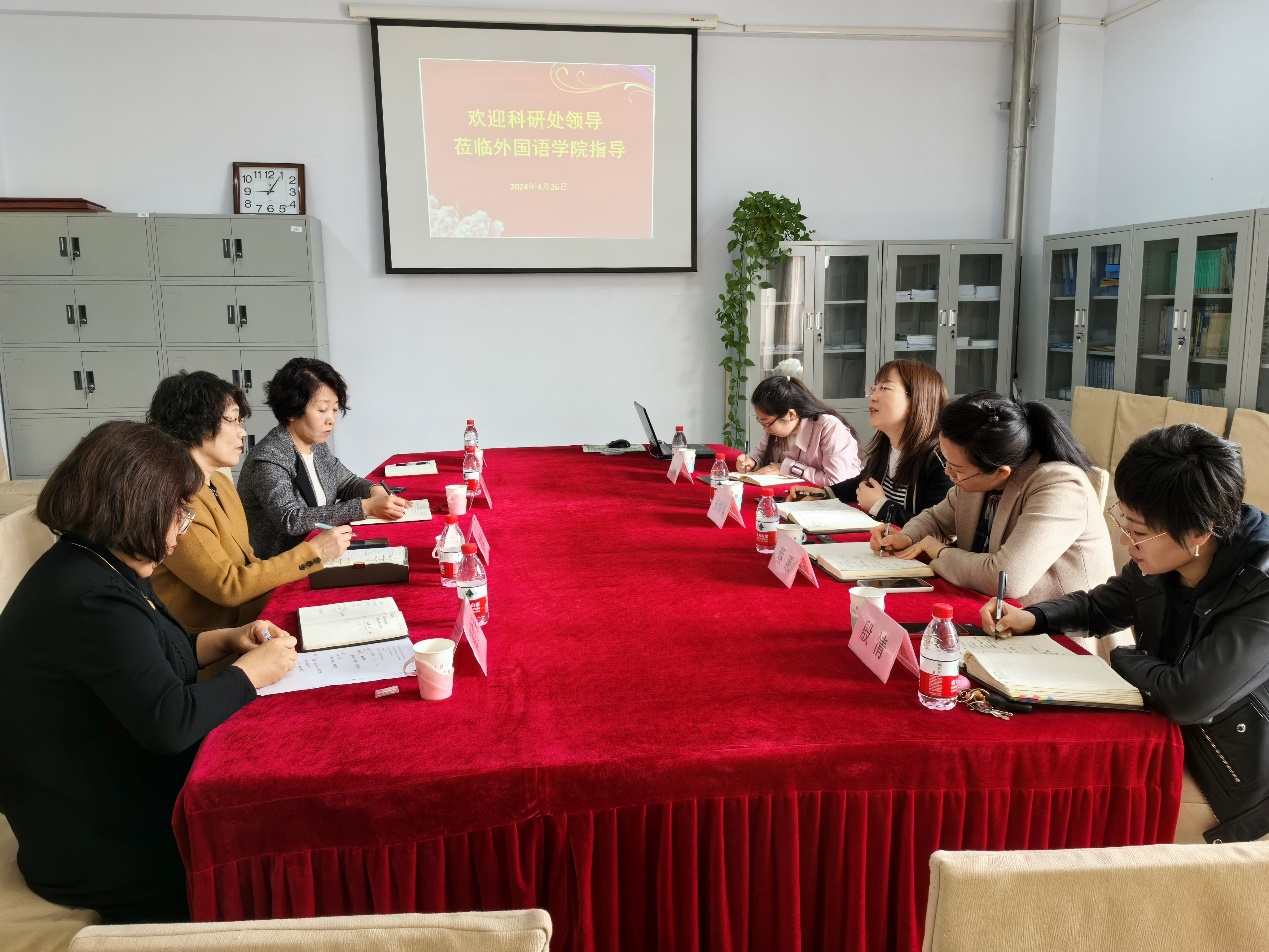 2024年4月26日上午,学校科研处处长张海华、副处长蔡惠、科长张娟和殷情四位同志莅临我院开展工作调研。我院党委书记范群英、院长崔海英、副院长范学荣及学科秘书刘洋洋出席座谈会。